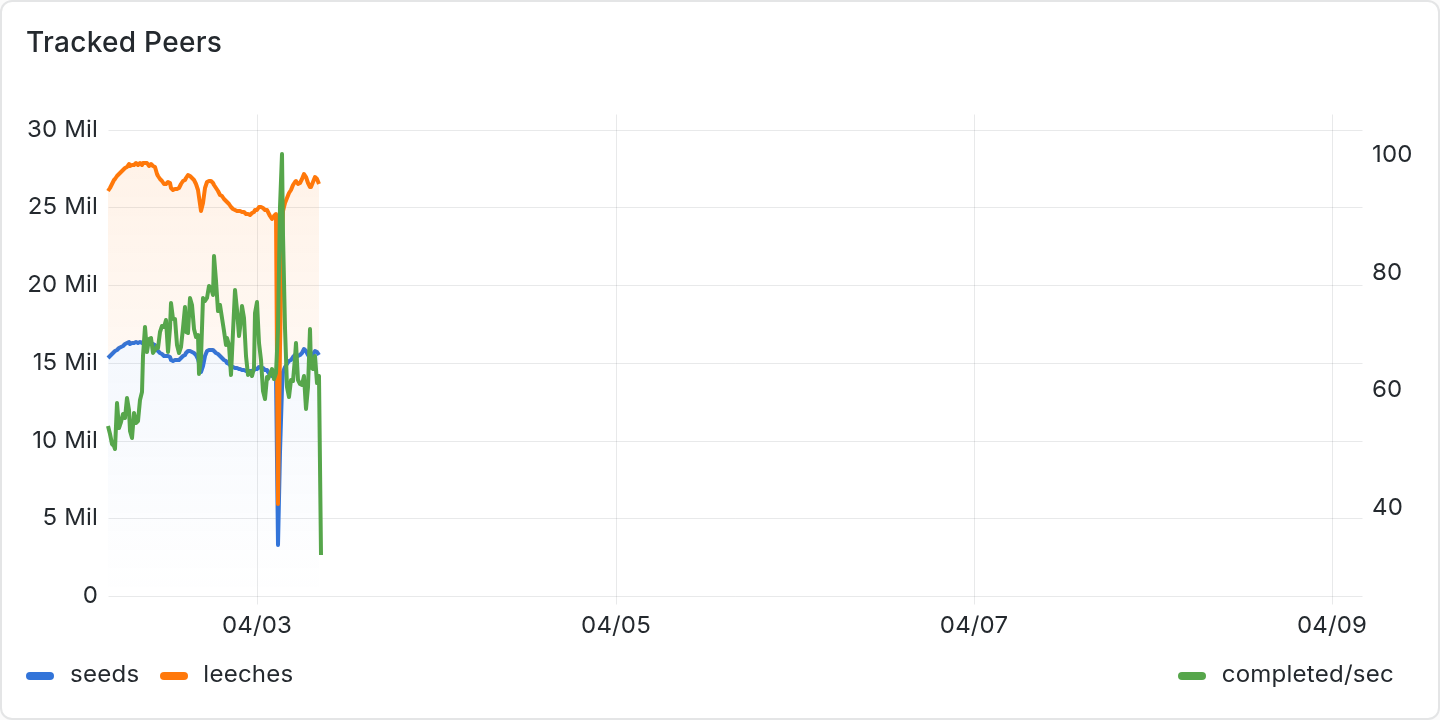 Be aware: the BitTorrent tracker protocol precludes the ability for us to know what data is represented by a given hash. In other words, we do not know and have no ability to control what is being shared among peers. Abuse of the tracker (such as excessive scraping) will result in revocation of access.